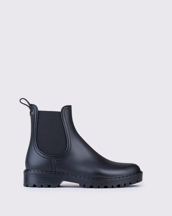 Botín de agua para mujeres que buscan practicidad sin renunciar al estilo. Este botín con acabado mate combina ligereza, flexibilidad y un diseño moderno tipo chelsea con elásticos laterales, que facilita el calce y aporta un toque sofisticado.